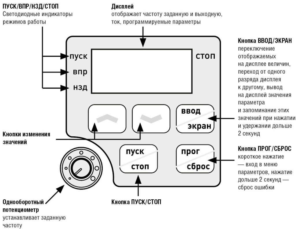 - регулирование скорости, задаваемой аналоговыми сигналами, цифровой сетью или ручкой потенциометра на лицевой панели.