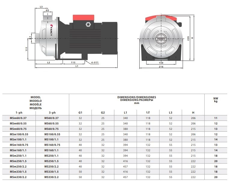 Насос FANCY из нержавеющей стали 304 MS60/0.37 арт. 156MS330000 – это моноблочный, одноступенчатый, центробежный насос с осевым резьбовым всасывающим патрубком и радиальным резьбовым напорным патрубком.